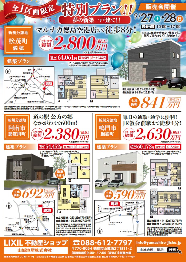 徳島不動産売買なら山城地所 会社概要 お問い合わせ アクセス ログイン トップTOP 不動産を探すSEARCH 不動産を売却するSELLING リフォームREMODELING リフォームについて リフォーム実績 よくある質問FAQ 山城地所HOME'sHOME's 家づくりについて 新築実績 不動産を探す 不動産を売却する リフォーム リフォームについて リフォーム実績 よくある質問 山城地所HOME's 家づくりについて 新築実績 会社概要 アクセス お問い合わせ ログイン UP DATE2025.09.27 CATEGORYNEWS 【イベント情報】9月27日・28日★3ヵ所同時土地販売会開催★ Tweet Tweet 投稿ナビゲーション ← prev 山城地所おすすめの物件はこちら 土地 徳島県徳島市丈六町丈領 徳島市 丈六町丈領 高台に位置している丈六台ヒルズが堂々完成。残り区画あと僅かとなっております。洪水・土砂災害・津波災害警戒区域外のため災害時にも安心安全です。お気軽にお問合せお待ちしております。 戸建 徳島県美馬市脇町字拝原 グリーンタウン脇町 モデルハウス② 戸建 徳島県徳島市北矢三町4丁目 徳島市北矢三 建売③ 戸建 徳島県徳島市川内町大松 徳島市川内町大松 建売 一級建築士監修!乾太君完備!!暮らしやすさを追求した一戸建ての分譲住宅です。 専用にはタイルデッキ完備でBBQやお子様プールも楽しめます 第1種熱交換換気システム搭載のオール電化エコ住宅…
